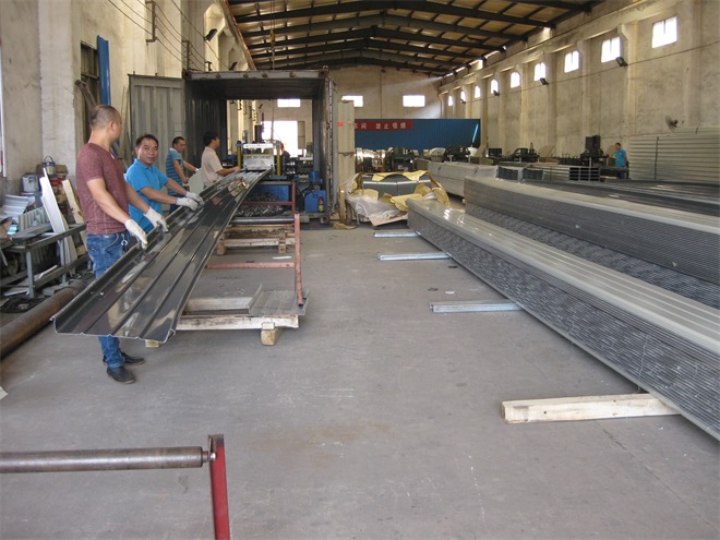 YX65/430型直立鎖邊鋁鎂錳板生產(chǎn)實(shí)拍、顏色深灰色(鐵青灰)、板長(zhǎng)14.5米。