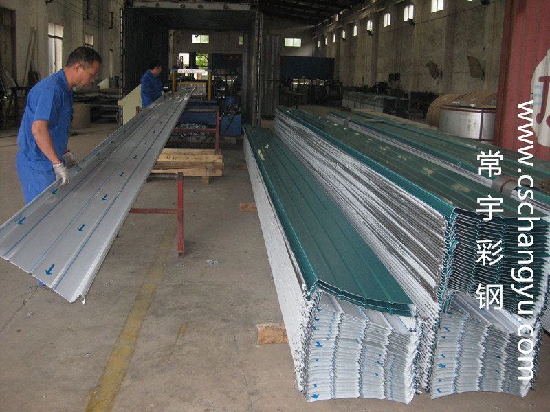 圖為長沙常宇彩鋼430型直立鎖邊鋁鎂錳板車間生產(chǎn)中